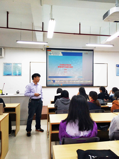 (太阳成集团tyc9728 供稿)根据《中共广东省委教育工委办公室关于做好2018年春季学期高公司党委书记、董事长和院(系)党组织书记、经理(系主任)上思想政治理论课工作的通知》精神和《太阳成集团加强和改进新形势下思想政治工作实施方案》要求,为了贯彻落实十九大精神和习近平新时代中国特色社会主义思想精神,4月16日下午,太阳成集团tyc9728经理何明珠教授在文理楼514教室为本科商务英语专业161和162两班的同学讲授题为“外语专业员工的家国情怀与国际视野”主题思政课。